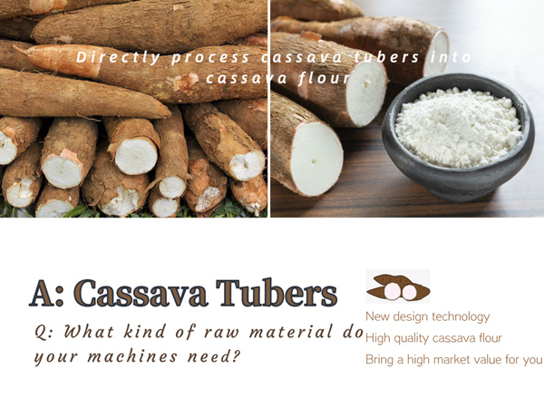 Answer: Cassava tubers. DOING Company's cassava flour processing machine can directly process the fresh cassava tubers into cassava flour. Processing cassava flour by cassava chips is out of date. It can't guarantee the quality of cassava flour.